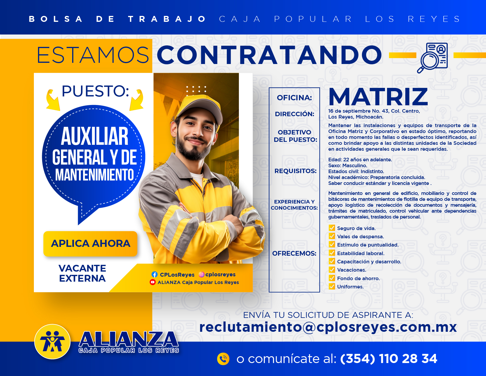 Bolsa de trabajo Únete a nuestro equipo de trabajo Verificador de crédito agropecuario – Apatzingan Auxiliar General y de Servicios – Buenavista Verificador de crédito agropecuario – Tepalcatepec Auxiliar General y de mantenimiento - Oficina Matriz Verificador regional de crédito agropecuario - Sucursal Buenavista Ejecutivo Financiero Sucursal Mazamitla